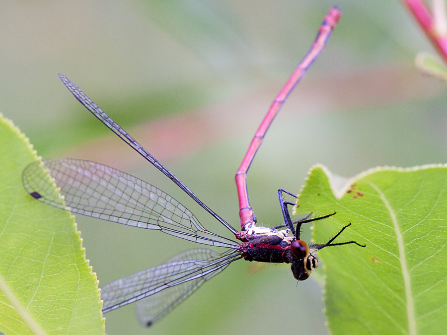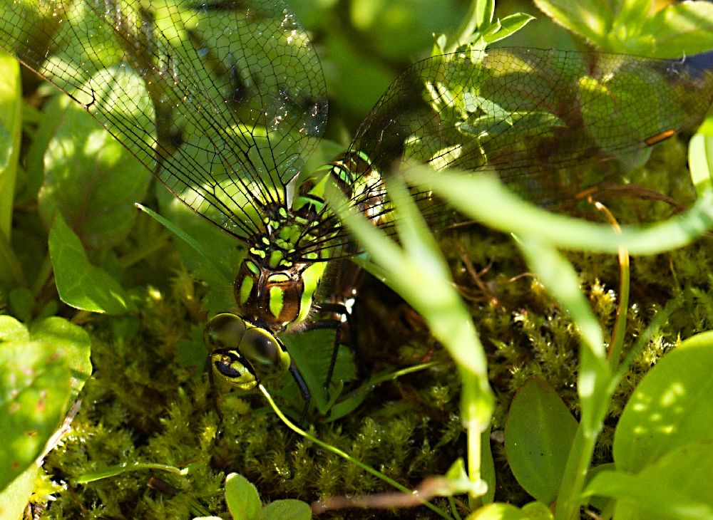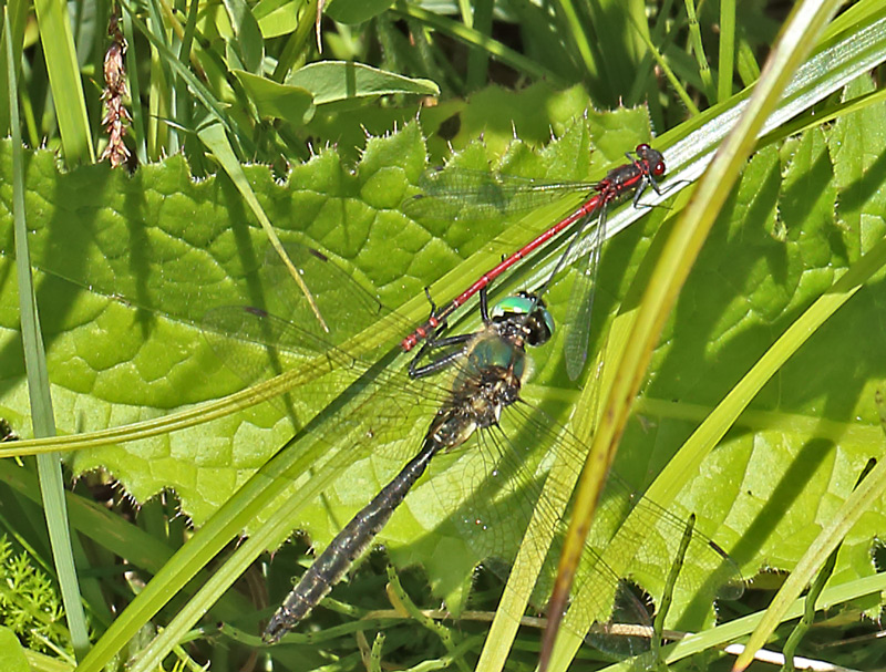 Lesklica Somatochlora alpestris a šidielko červené, už som si myslel,že si na ňom pochutná, ale dala mu pokoj.